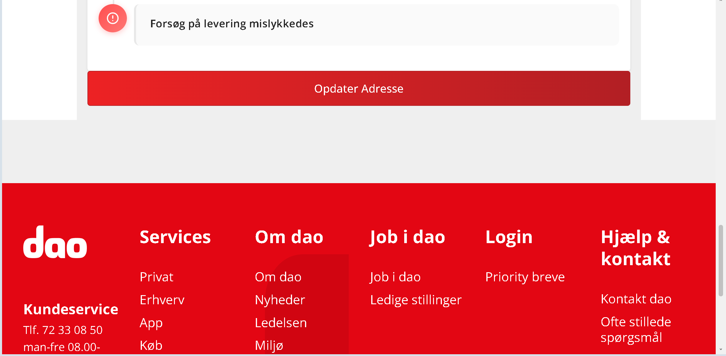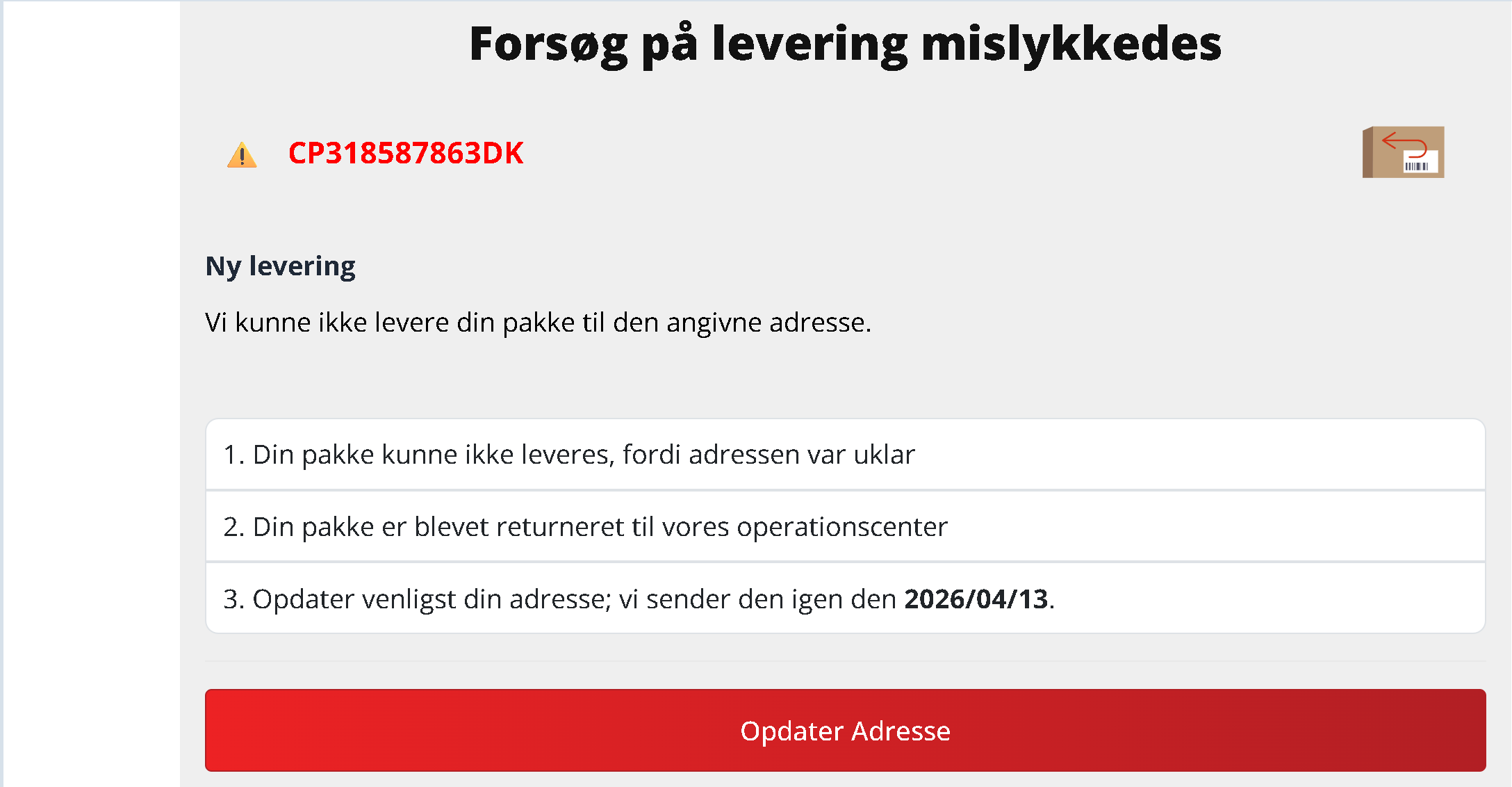 This phishing campaign impersonates dao, a Danish parcel delivery service. The scam uses a fake “delivery failed” notification to trick victims into providing personal information, which can later be used for identity theft or to redirect victims to a payment page where credit card details are stolen.