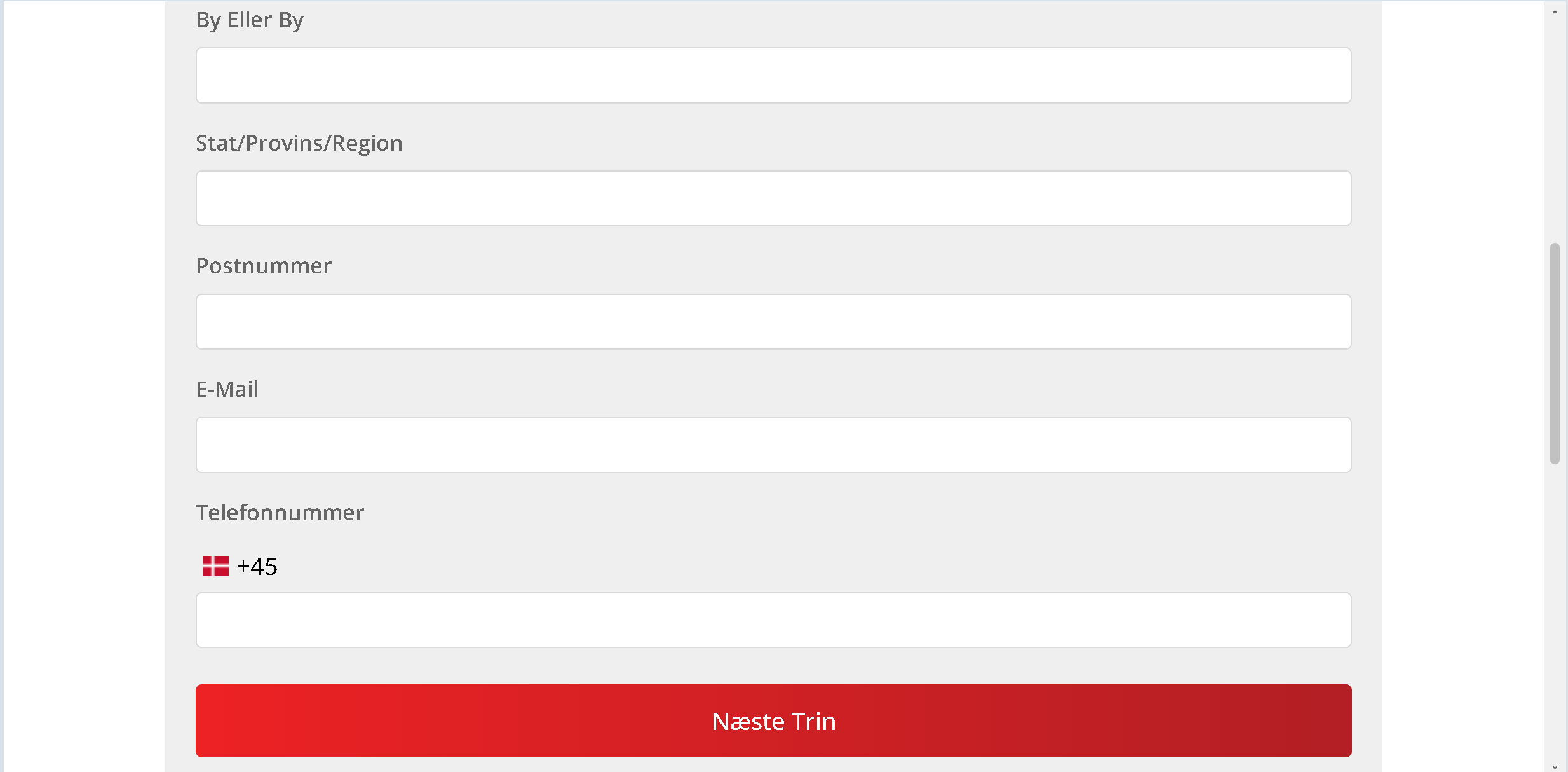 Address Update Form – The victim is taken to a page that asks for personal details: first name, last name, street address, city, postal code, email, and phone number (with Danish country code +45 pre‑filled).