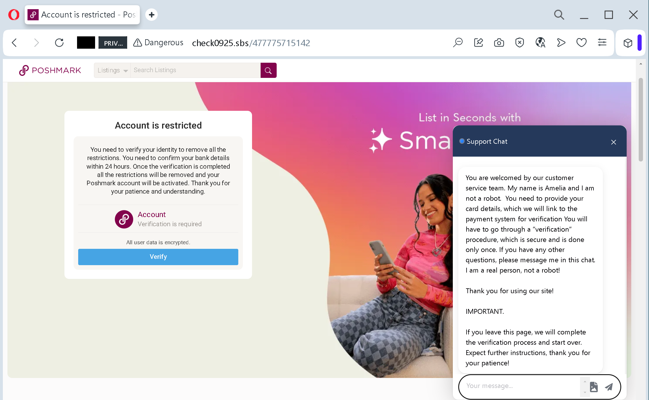 1. Fake Account Restriction Page – The victim receives a link (via email, SMS, or social media) claiming their Poshmark account is restricted. The page shows a countdown or threat that the account will be deactivated within 24 hours. A “Verify” button is prominently displayed. A fake live chat window appears, with a “support agent” (e.g., “Amelia”) explaining that the victim must provide card details for verification.