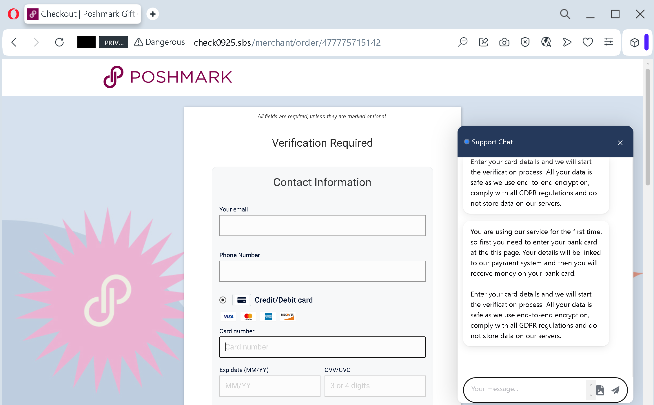 • Suspicious URL: The page is hosted on a domain like check0925.sbs, not poshmark.com. Legitimate Poshmark pages are only on official domains.