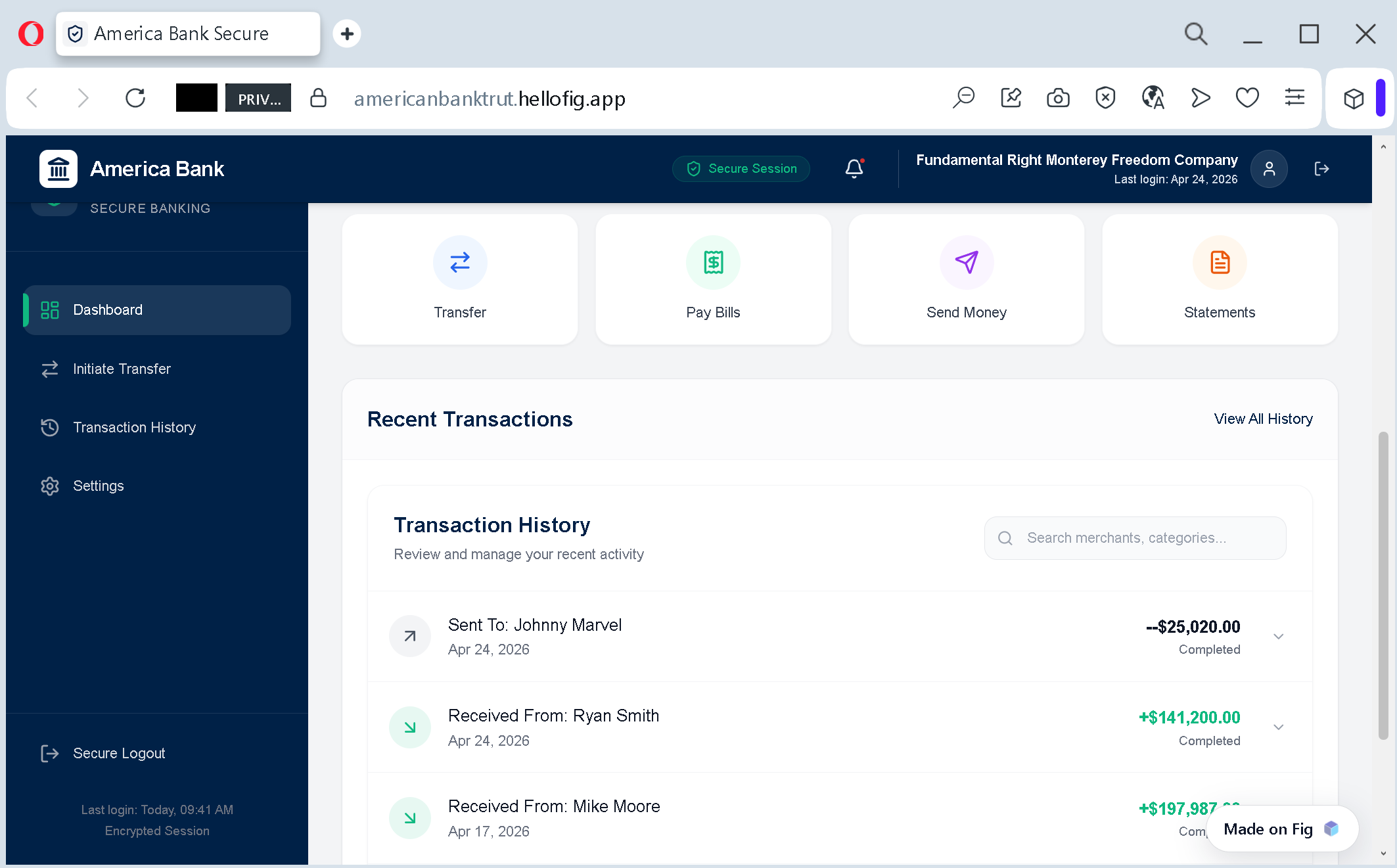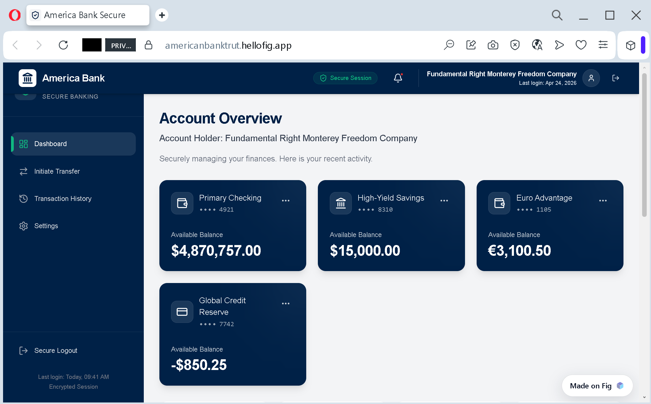 This screenshot shows a sophisticated phishing dashboard designed to look like a high-end online banking portal. The attacker is using a legitimate Fintech-as-a-Service (FaaS) platform, Fig, to build a believable user interface that mimics a real bank’s “Account Overview.”