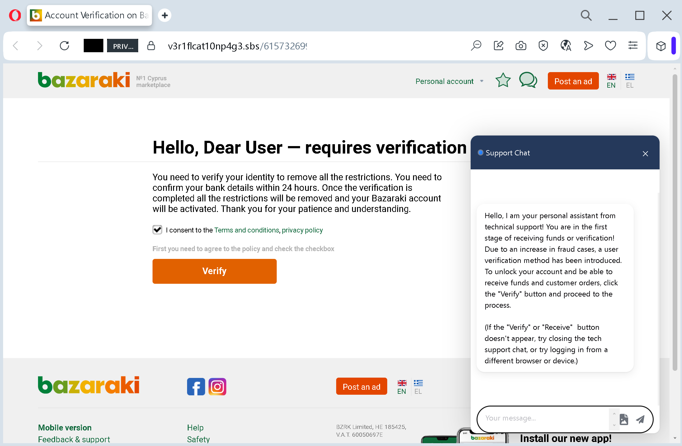 - Unsolicited verification request: Bazaraki does not send links requiring users to verify their identity via external pages. All account-related actions are done within the official website after logging in normally.