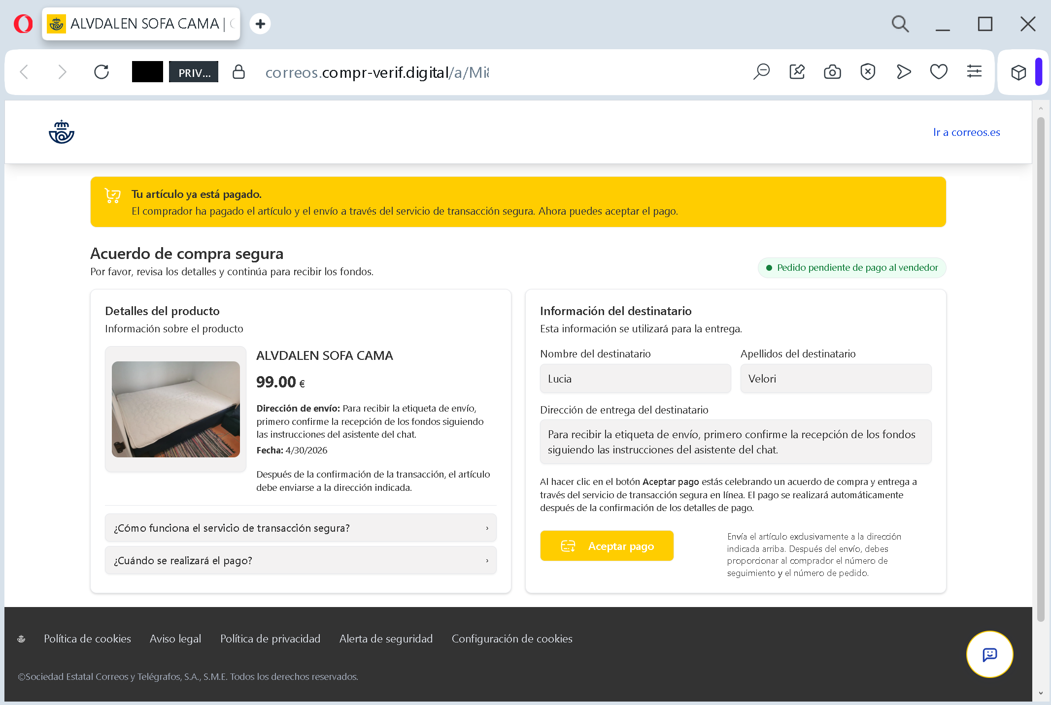 The scammer contacts a seller pretending to be a buyer. They claim they have already paid for the item through a “secure transaction” service provided by a well-known logistics company (in this case, Correos).